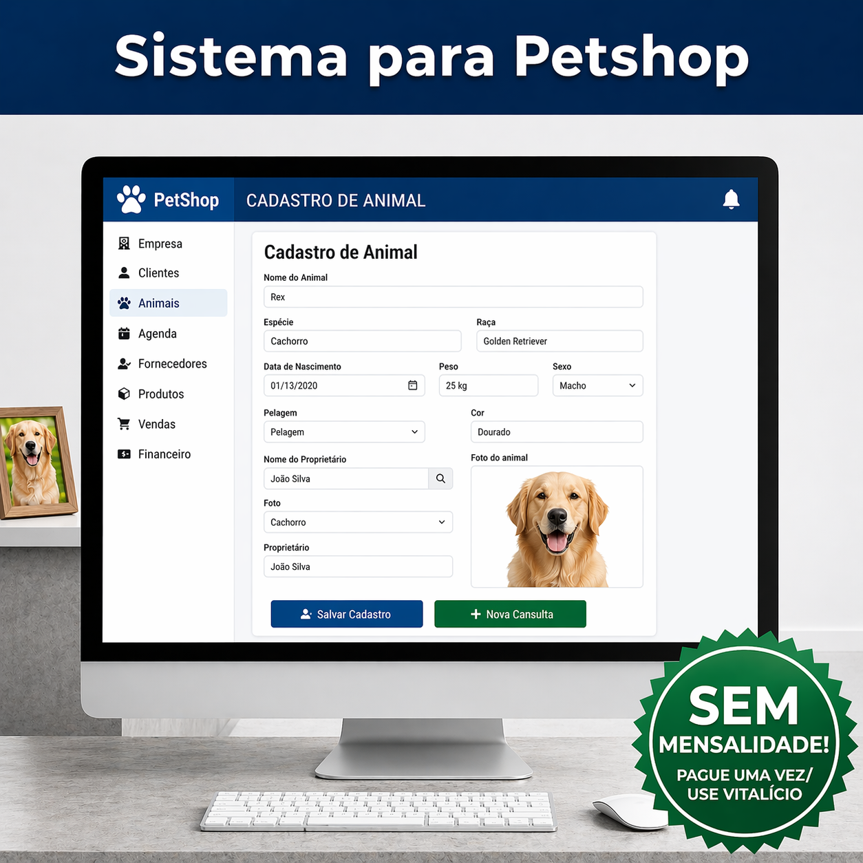 Organize atendimentos, clientes, animais e finanças em um único sistema simples de usar, instalado diretamente no seu computador.